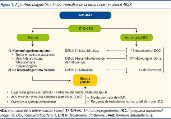 Si el cariotipo es 46XX y los niveles de 17-OH-PG son elevados, deberemos descartar hiperandrogenismo por HSC. Niveles normales dirigirán las investigaciones hacia un exceso de andrógenos de origen materno o placentario. Descartado todo lo anterior, será obligada la laparoscopia con biopsia gonadal para buscar anomalías del desarrollo gonadal (figura 1).