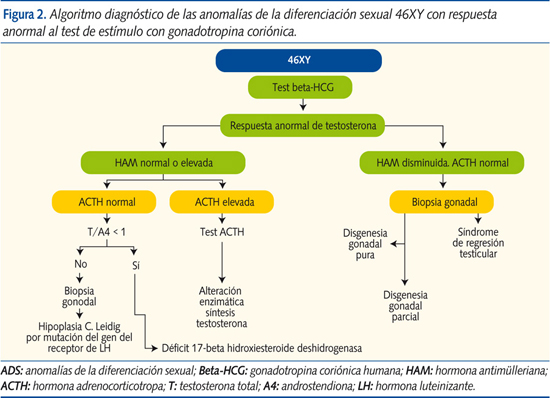 Una vez conozcamos que el cariotipo es 46XY, procederemos a objetivar si existe alteración en la biosíntesis de testosterona (respuesta de testosterona tras test de estímulo con gonadotropina coriónica [beta-HCG]). Cuando se objetiva un defecto de la síntesis de testosterona, también debe ser evaluada la función suprarrenal (test de estímulo con ACTH) para localizar el lugar del defecto enzimático (suprarrenal o testicular)3. La HAM, que es un marcador de la existencia de tejido testicular, nos ayudará al diagnóstico (figura 2).