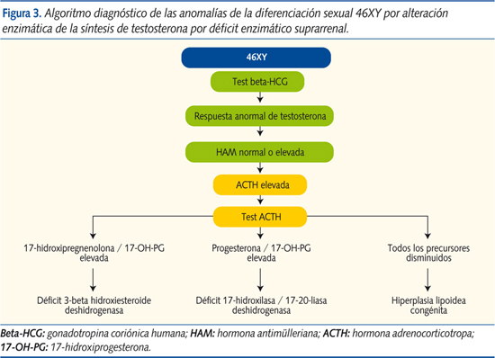 - Hipoplasia/aplasia de las células de Leydig por mutación del gen LHCGR: presenta niveles elevados de LH y disminución de la síntesis de testosterona con defecto en la virilización. Cursa con disminución de la síntesis de testosterona (test de estimulación con HCG con valores anormalmente bajos de testosterona; en la aplasia de células de Leydig, niveles ausentes) y niveles normales o aumentados de la HAM. Una ACTH basal y un test de ACTH en valores normales descartan alteración enzimática suprarrenal. La relación testosterona/androstendiona > 1 orienta al diagnóstico, que se confirmará con biopsia gonadal y estudio molecular del gen.
