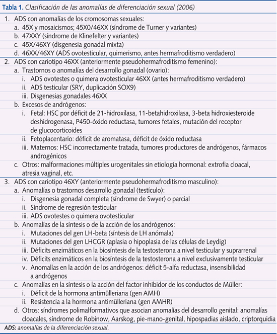 En el año 2006 se decidió consensuar la terminología a emplear, desechando aquellos términos que resultaban peyorativos, tales como intersexo, hermafroditismo/pseudohermafroditismo, etc. Desde entonces se habla de ADS1 (tabla 1).