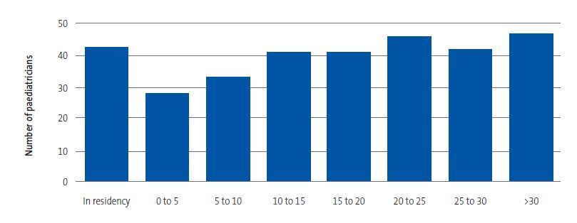 Figure 1 shows the distribution of participants by the number of years of professional experience. The first bar represents medical residents, and all other bars represent the rest of the participants (combining primary care and hospital-based paediatricians).