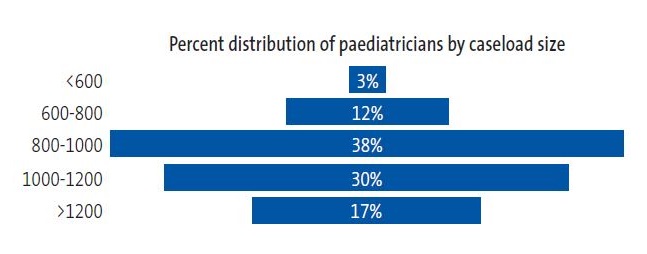 When it came to the caseloads of primary care paediatricians, they varied widely between participants. As can be seen in Figure 2 , these practitioners most frequently had caseloads of 800-1000 children (38%), followed by 1000-1200 children (30%) and caseloads greater than 1200 children (17%).