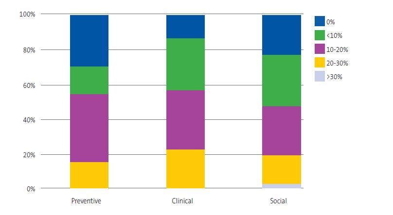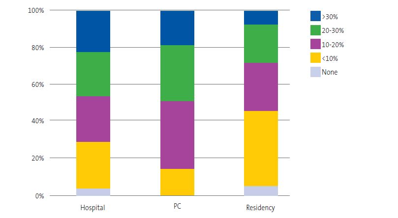Figure 3 presents the time spent by participants on health promotion activities, evincing differences between care settings (χ2(8) = 26.1; p <0.001). Most paediatricians reported engaging in health promotion activities, but those who worked at the primary care level spent the most time on them, especially compared to residents.