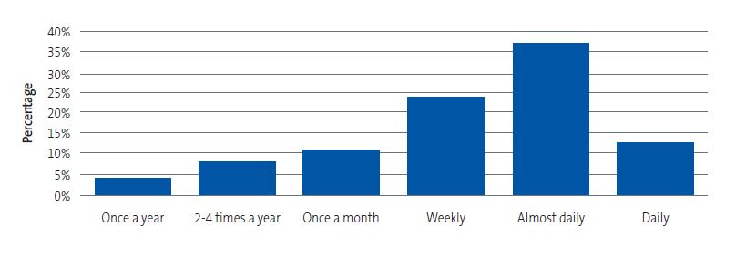 In the subset of paediatricians who reported performing reading promotion activities, there were substantial differences in how frequently they carried them out (Figure 7), with half of them reporting a daily or almost daily frequency.