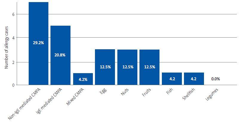 Three percent of the sample had a food allergy. Most of these patients (89.5%) were younger than 4 years. Of the total children with FA, 47.4% also developed asthma. We included non-IgE mediated cow’s milk protein allergy (CMPA) among the IgE-mediated food allergies on account of its high prevalence and its potential association with future development of atopic diseases.12