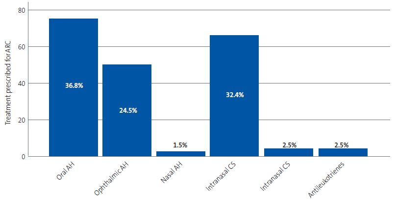 The most frequent treatment was an oral antihistamine, used in 36.8% of cases. This was followed by treatment with a nasal corticosteroid, prescribed in 32.4% of cases, and an ophthalmic antihistamine, prescribed in 24.5%. Figure 2 provides a graphic representation of these data.
