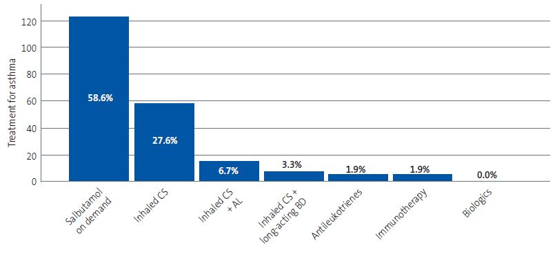 The most frequently used treatments were on-demand salbutamol (58.6%) and inhaled corticosteroids as monotherapy (27.6% of cases). Figure 3 provides a graphic representation of these data.