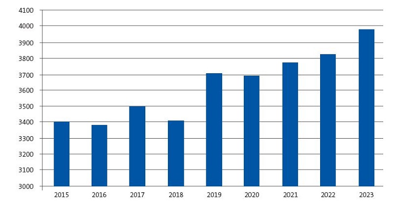 The report offers this information for the past 9 years, and a first perusal suggests that there has been considerable delay in the order in which candidates chose paediatrics spots: in 2015 the last paediatrics spot was allocated in 3399th place compared to 5081st place in 2023, a 49% delay. However, this is not an accurate picture, as in the same period the number of spots in paediatrics increased from 392 to 501. Adjusting the calculation to the increase in the number of spots, the actual delay in the allocation of spots was 17%, as can be seen in Figure 1.