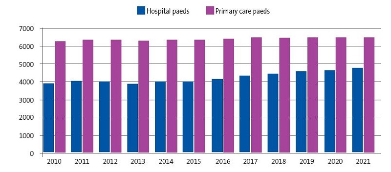 | Figure 3. Number of paediatrician positions in the hospital and primary care systems in the 2010-2021 period according to data from the Ministry of Health |