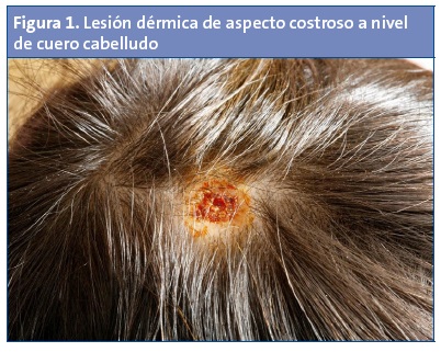 Se presenta el caso de una niña de ocho años de edad que acude al Servicio de Urgencias con la presencia de fiebre y una lesión costrosa, de aspecto necrótico, en el cuero cabelludo, así como adenopatías de localización cérvico-occipital y retroauricular, refiriendo la picadura de una garrapata hace 15 días. El diagnóstico se confirma mediante la presentación clínica y serologías cruzadas con Rickettsia conorii. Tras pauta de eritromicina a dosis de 40 mg/kg/día durante ocho días se evidencia la desaparición progresiva de las lesiones a lo largo de un mes.
