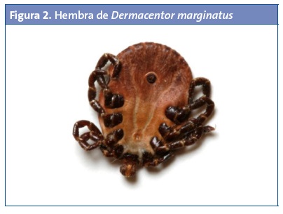 ● Dermatocentor ● Linfadenopatía ● RickettsiasNiña de ocho años, natural de la provincia de Huesca (España), sin antecedentes de interés, que acude a la consulta ante la presencia de una lesión dérmica en el cuero cabelludo (Fig. 1) y adenopatías de localización cérvico-occipital de varios días de evolución. En la exploración se observa una lesión costrosa en el cuero cabelludo occipital, de 3 × 3 cm, que se desprende fácilmente, sin presencia de escara ni zona eritematosa. De la misma manera, se observan tres adenopatías retroauriculares y occipitales, de 2 cm de diámetro, muy dolorosas a la palpación, sin otros hallazgos de interés. La paciente refiere picadura de garrapata hace 15 días, la cual fue identificada dentro de la especie Dermacentor marginatus (Fig. 2).