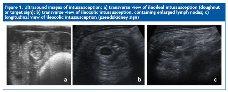 | Figure 1. Ultrasound images of intussusception: a) transverse view of ileoileal intussusception (doughnut or target sign); b) transverse view of ileocolic intussusception, containing enlarged lymph nodes; c) longitudinal view of ileocolic intussusception (pseudokidney sign) |