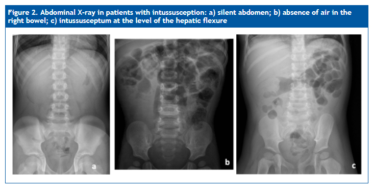 | Figure 2. Abdominal X-ray in patients with intussusception: a) silent abdomen; b) absence of air in the right bowel; c) intussusceptum at the level of the hepatic flexure |