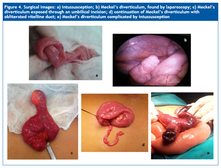 | Figure 4. Surgical images: a) intussusception; b) Meckel’s diverticulum, found by laparoscopy; c) Meckel’s diverticulum exposed through an umbilical incision; d) continuation of Meckel’s diverticulum with obliterated vitelline duct; e) Meckel’s diverticulum complicated by intussusception |