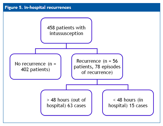 There were records of 78 recurrences in 56 patients (12.2% of cases, range 1-4), with a mean time elapsed from the first episode of 173.4 days (SD 284.7, range 0-1292). Fifteen such cases (19.2%) occurred in hospital, 11 patients had a single recurrence, and 2 patients had two recurrences (Figure 5). Air enema was the initial treatment used in 90% of first recurrences and 81.8% of second recurrences. There were no complications from this intervention and no patients died.