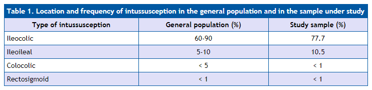 The sample of patients obtained in our study had a mean age and sex distribution that was consistent with the existing medical literature (with a majority of patients being male and aged less than 3 years). This was also the case when it came to the site of intussusception, which was most frequently ileocolic, and to the percentage of patients in which a cause for intussusception was identified (2.4%).