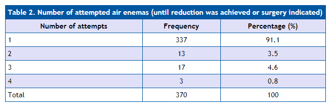 | Table 2. Number of attempted air enemas (until reduction was achieved or surgery indicated) | ||