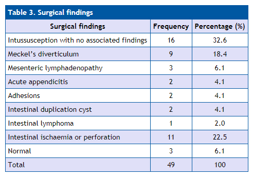 Surgery was performed when reduction could not be accomplished by performance of air enema, or when the patient was clinically unstable or in poor general health. In our series, 49 cases (10.7%) required surgical intervention after the first episode of intussusception. Table 3 summarises the surgical findings. The most frequent diagnoses were: intussusception (of any type), managed by manual reduction by means of taxis manoeuvres; mesenteric lymphadenitis and Meckel’s diverticulum (Figure 4). Intestinal resection was necessary in 11 patients (22.4% of surgeries) due to bowel ischaemia or perforation.
