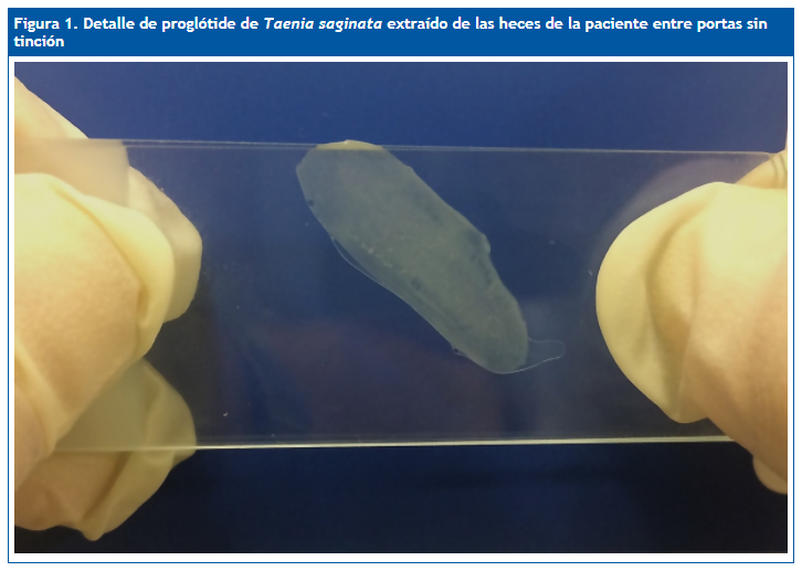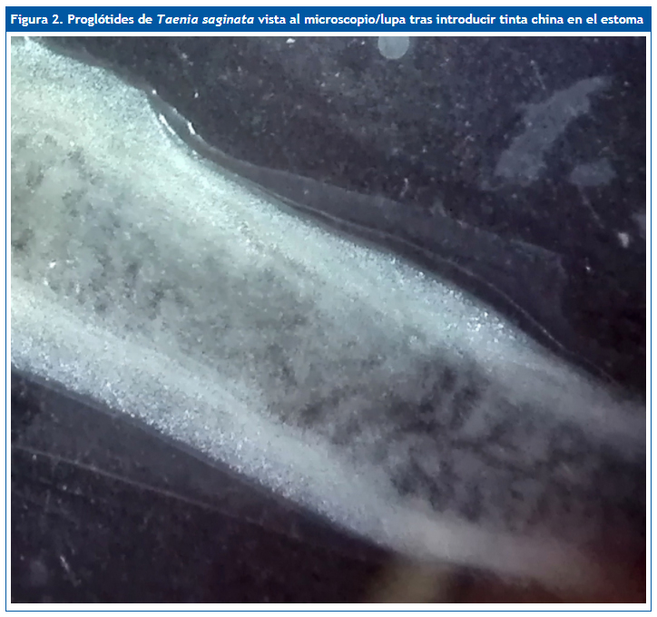 Se remite la muestra al laboratorio de microbiología de referencia, confirmándose por visión directa tras tinción con tinta china (Fig. 2) y reacción en cadena de la polimerasa directa para T. saginata (Centro Nacional, Majadahonda, Madrid). Tras el resultado, se le indica tratamiento con prazicuantel (10 mg/kg) por vía oral en dosis única (medicamento extranjero y off-label), sin presentar efectos secundarios. A los tres meses se realiza examen de heces en tres muestras, no visualizándose de nuevo proglótides de tenia.