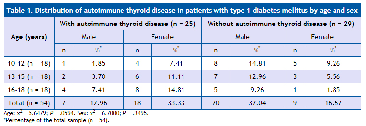 We conducted a cross-sectional descriptive study in 54 patients of both sexes with a diagnosis of T1D based on the criteria established by the World Health Organization (n = 54) managed at the endocrinology department of the Hospital Pediátrico Docente Juan Manuel Márquez (Havana, Cuba) between October 2015 and October 2016. We excluded patients treated with immunosuppressants and/or with intercurrent disease. The variables under study were: age, sex, duration of T1D, nutritional status, thyroid function and autoimmune thyroid disease. We collected the following data from the medical records of the patients: age, sex and duration of T1D. All patients underwent anthropometric measurements of their weight and height, followed by determination of TSH, total T4, and antithyroglobulin and antithyroperoxidase antibody levels. Based on their measured weight and height, patients were placed in the corresponding Cuban weight-for-height percentile table for their sex9,10 to obtain their percentile, which was interpreted according to the criteria established for Cuba. Test samples were obtained by venipuncture at the clinical laboratory after 12 hours of fasting. Hormone levels (TSH, total T3 and T4) were measured at the laboratory of the hospital by solid-phase radioimmunoassay, while antibody levels (antithyroglobulin and antithyroperoxidase) were measured at the Instituto Nacional de Endocrinología (National Institute of Endocrinology) by means of electrochemiluminescence immunoassay.