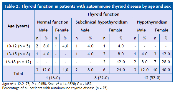 Table 2 compares thyroid function in patients with autoimmune thyroid disease by age and sex. In the comparison by age, we found that older patients had a greater degree of thyroid dysfunction compared to younger patients, with 9 (36.0%) of the 13 patients with hypothyroidism aged more than 16 years, 4 (16.0%) aged 13 to 15 years, and none aged 10 to 12 years. When it came to sex, there was a predominance of female patients, who amounted to 17 of these patients (68.0%).