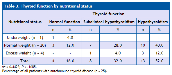 Table 3 presents current thyroid functioning in patients by nutritional status. The majority of patients, amounting to 20 (80.0%), had normal weight, and 10 of them (40.0%) presented with hypothyroidism.