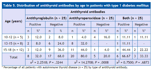 The distribution of antithyroid antibodies by age in the studied sample of patients with T1D is shown in Table 5. We only found a significant association with age for antithyroperoxidase antibodies (P = .0008).
