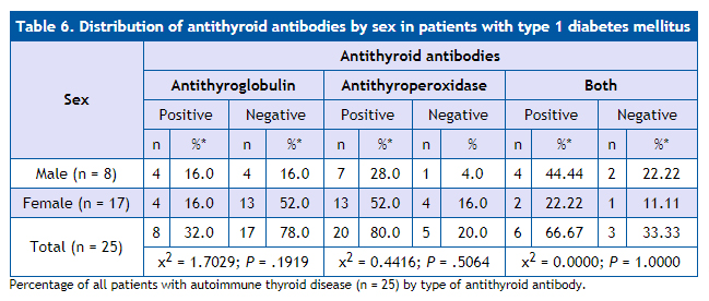 | Table 6. Distribution of antithyroid antibodies by sex in patients with type 1 diabetes mellitus | ||||||||||||