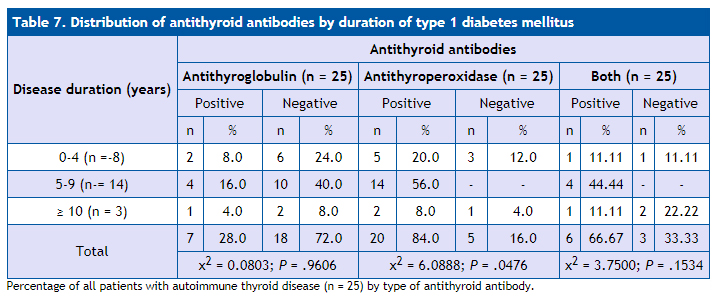 | Table 7. Distribution of antithyroid antibodies by duration of type 1 diabetes mellitus | ||||||||||||