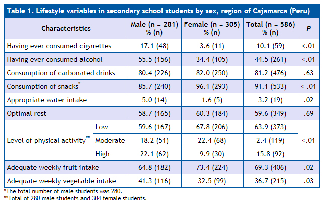 | Table 1. Lifestyle variables in secondary school students by sex, region of Cajamarca (Peru) | |||||