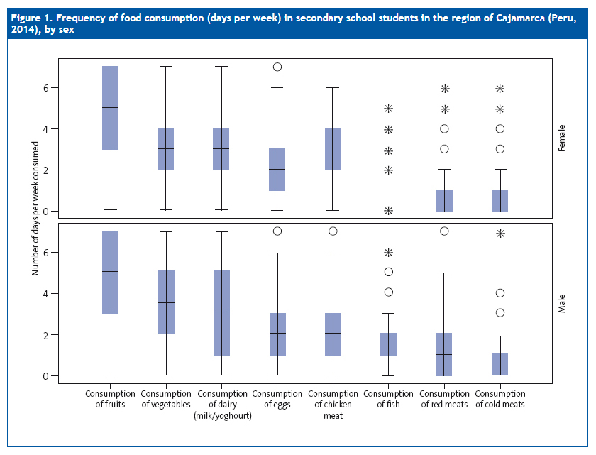 | Figure 1. Frequency of food consumption (days per week) in secondary school students in the region of Cajamarca (Peru, 2014), by sex |