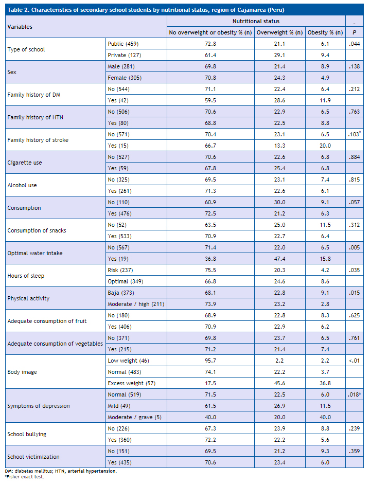 | Table 2. Characteristics of secondary school students by nutritional status, region of Cajamarca (Peru) | |||||