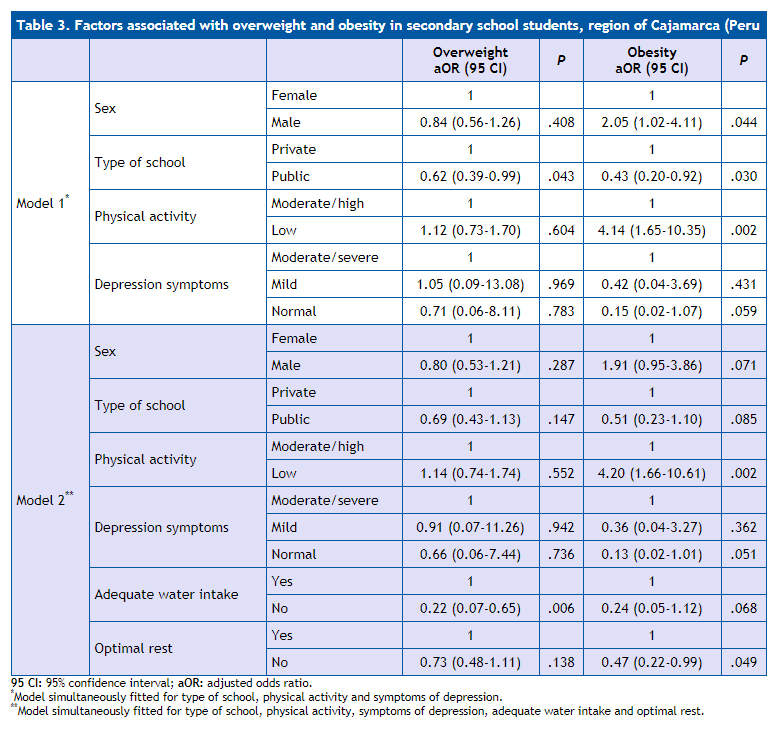 | Table 3. Factors associated with overweight and obesity in secondary school students, region of Cajamarca (Peru | ||||||