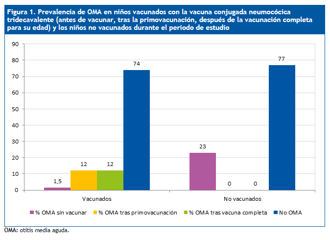 Catorce niños (29%) tuvieron OMA de repetición: seis tuvieron dos episodios, siete tuvieron tres episodios y uno tuvo cuatro episodios. De ellos, diez no acudían a la guardería, diez estaban vacunados y solo uno de los vacunados tuvo la OMA de repetición antes de la vacunación.