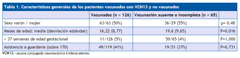 El 66% de los pacientes fue adecuadamente vacunado (en la fecha correspondiente o con desfase respecto al calendario habitual). El IC 95 de la cobertura vacunal fue de 57,3 a 71,4%. No hubo diferencias en cuanto al sexo, edad gestacional o asistencia a guardería del grupo de niños vacunados respecto a los no vacunados, aunque la edad de los niños vacunados fue menor que la de los no vacunados (Tabla 1).