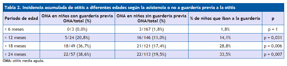 | Tabla 2. Incidencia acumulada de otitis a diferentes edades según la asistencia o no a guardería previa a la otitis | ||||