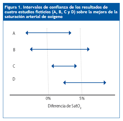 | Figura 1. Intervalos de confianza de los resultados de cuatro estudiosficticios (A, B, C y D) sobre la mejora de la saturación arterial de oxígeno |