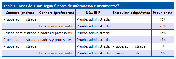 | Tabla 1. Tasas de TDAH según fuentes de información e instumentos9 | ||||