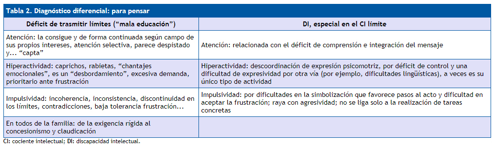 En todos estos casos no vale decir comorbilidad, ya que los síntomas acontecen en el desarrollo del trastorno como tal y no concurren desde otro diagnóstico. Como ejemplo, se plantea el diagnóstico diferencial con dos de estos procesos, el retraso mental y los límites educativos insuficientes o inadecuados (Tabla 2)9,11.