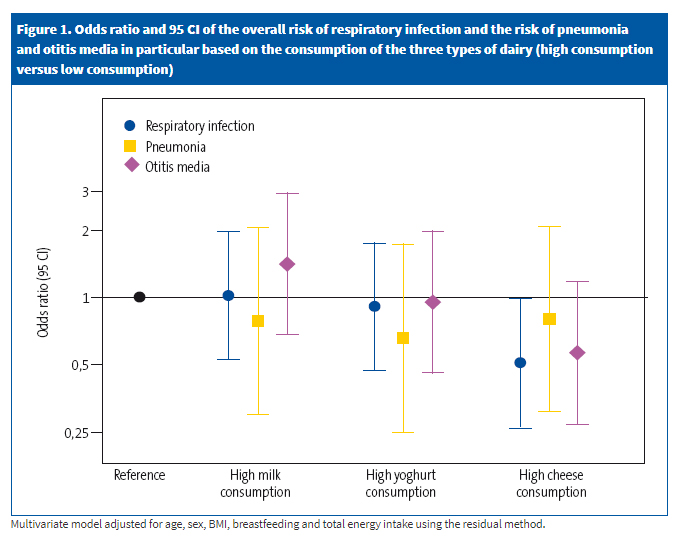 Results: we found no association between the consumption of dairy products and the respiratory diseases under study (odds ratio: 0.85; 95% confidence interval: 0.44 to 1.64]). In the separate analysis of each dairy category, we found an inverse correlation between consumption of cheese and overall respiratory disease (odds ratio: 0.50; 95% confidence interval: 0.26 to 0.98), but no association with a specific infection (acute otitis media or pneumonia). We found no significant differences in outcomes for any other dairy category (milk or yoghurt).