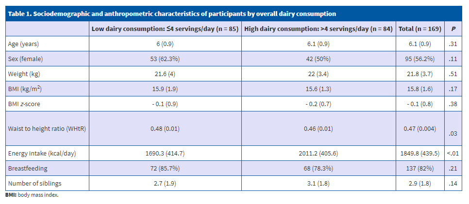 The final sample included a total of 169 children (56.2% female) born between 2008 and 2010 (mean age, 6.1 years; standard deviation [SD], 0.92) (Table 1). The mean BMI was 15.77 (SD: 1.71) and the mean WHtR was 0.47 (SD: 0.05). The total energy intake was significantly higher and the WHtR significantly lower in the high dairy consumption group compared to the low dairy consumption group. We did not find any other significant differences in the rest of the variables under study.