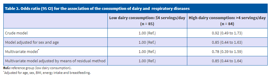 | Table 2. Odds ratio (95 CI) for the association of the consumption of dairy and respiratory diseases | ||
