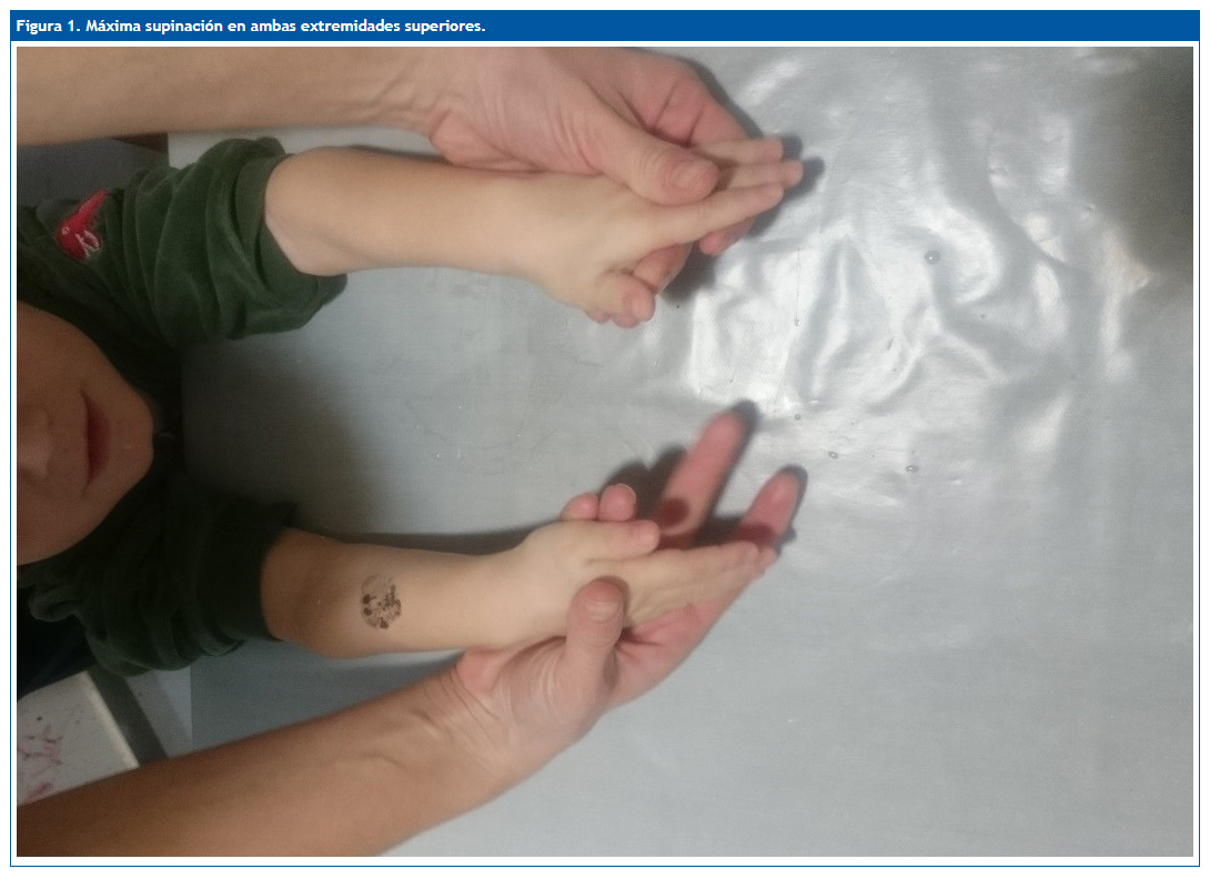 En la exploración se apreció una supinación limitada en ambos antebrazos, consiguiendo la máxima supinación en una posición intermedia, quedando las manos con el pulgar hacia arriba, provocando dolor al intentar mayor supinación (Fig. 1) La flexión del codo era normal y la extensión estaba limitada unos 10°.