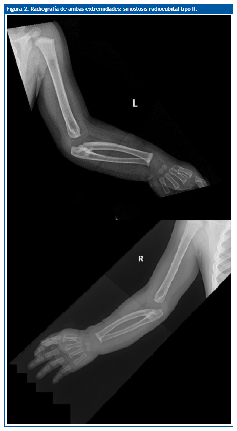 Se solicitó una radiografía de ambos brazos (Fig. 2) en la que se observó sinostosis radiocubital bilateral a nivel proximal, con ligera deformidad y subluxación de ambas cabezas femorales e incurvación diafisaria en los radios.