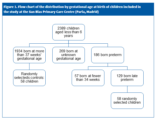 | Figure 1. Flow chart of the distribution by gestational age at birth of children included in the study at the San Blas Primary Care Centre (Parla, Madrid) |