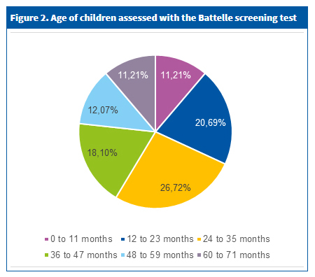 The Battelle Developmental Inventory includes a screening test whose results are highly correlated to the results of the whole diagnostic battery (0.96, except for the cognitive domain, for which it is 0.92).13 This is the screening test that was performed in every child, regardless of age, producing homogeneous data that allowed comparison.16 This screening test, comprised of 96 items, assesses the basic skills and milestones of children aged 0 to 8 years in the personal-social, adaptive, motor, language and cognitive domains.
