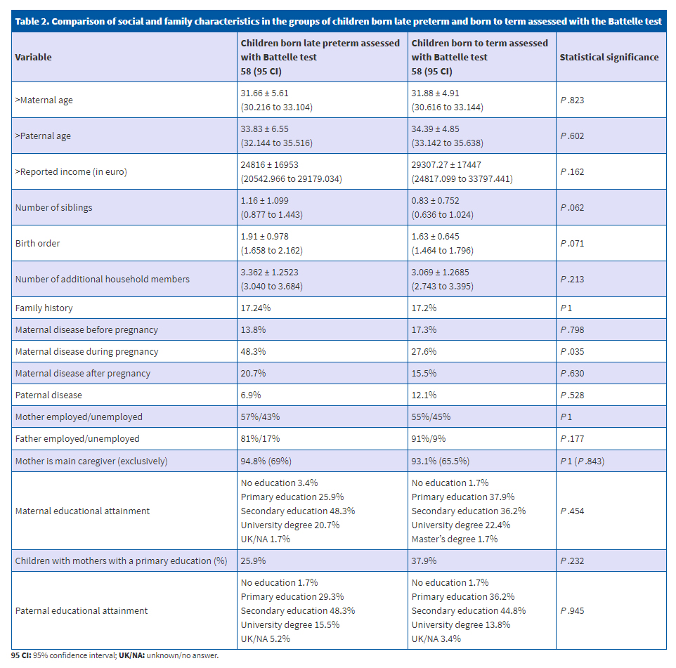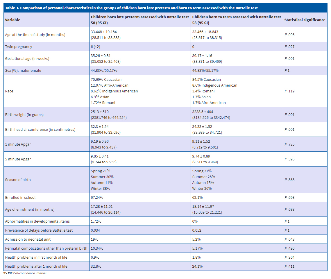Patients and methods: the study included 58 children aged less than 6 years managed at a primary care centre in the region of Madrid born between 34 and 37 weeks’ gestation (late preterm) and matched controls born to term. We used the Battelle Developmental Inventory to assess the presence of developmental delays.