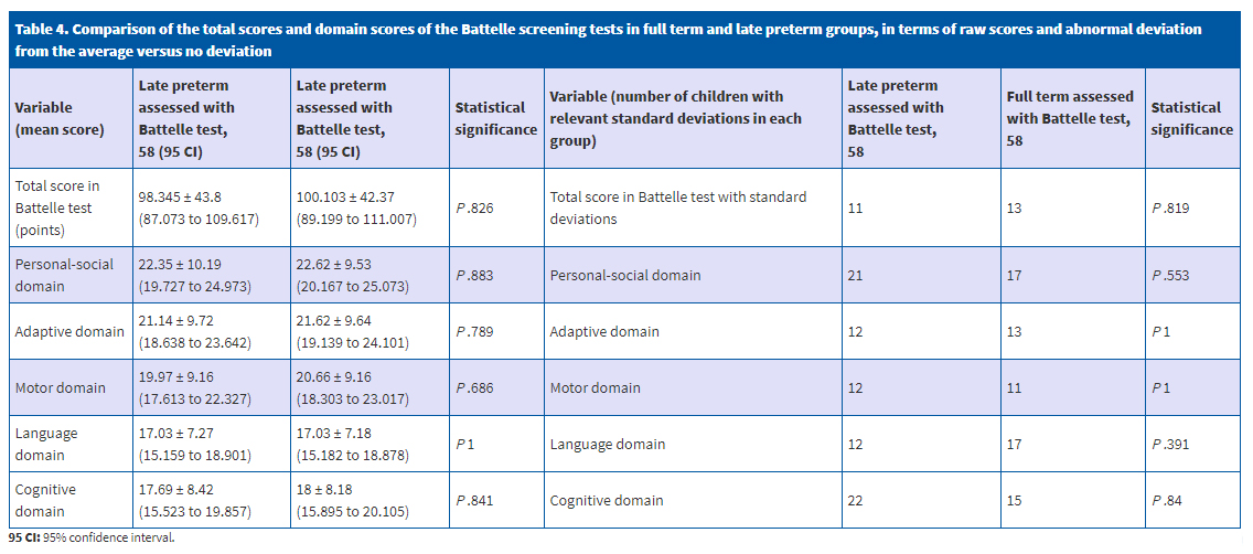 | Table 4. Comparison of the total scores and domain scores of the Battelle screening tests in full term and late preterm groups, in terms of raw scores and abnormal deviation from the average versus no deviation | |||||||
