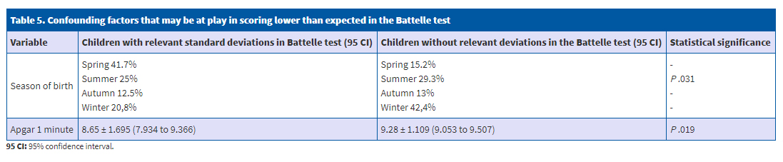 We compared the variables listed in Table 1, classifying children according to whether or not they had a relevant deviation on performing the screening test. Our aim was to identify risk factors, and we found that season of birth and the 1 minute Apgar score were associated with an increased risk of developmental delay (Table 5).
