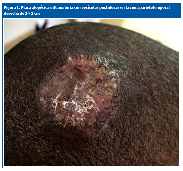 | Figura 1. Placa alopécica inflamatoria con vesículas pustulosas en la zona parietotemporal derecha de 3 × 3 cm |